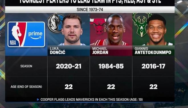 需要关注的是,历史上最年轻的得分、篮板、助攻、抢断均领衔全队的球员,分别有20-21赛季,22岁的东契奇;84-85赛季,22岁的迈克尔乔丹,16-17赛季,22岁的字母哥。本赛季弗拉格得分篮板助攻抢断也领衔全队,而弗拉格仅仅只有19岁。