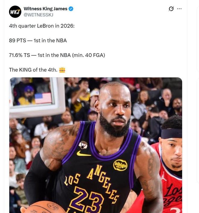 同时,詹姆斯还创下了两大纪录。第1、自进入2026年,詹姆斯末节得分89分,同期联盟第1。第2、自进入26年以来,詹姆斯末节真实命中率71.6%,同期NBA联盟第1(至少40出手)。